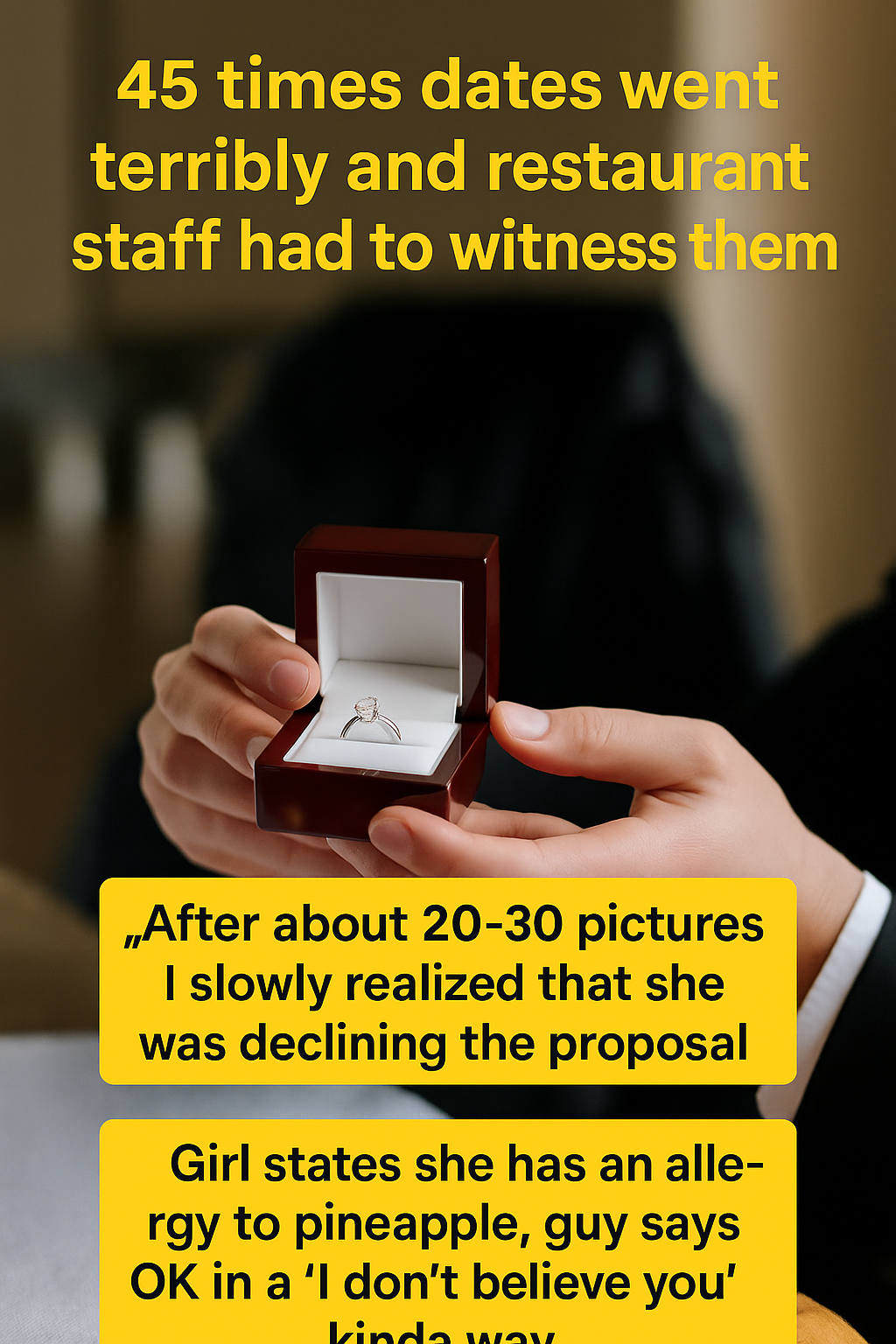 In the bustling world of dining, restaurant staff are often silent witnesses to countless personal moments—some heartwarming, some humorous, and others painfully awkward. Recently, a compelling collection of stories has emerged, highlighting 45 times dates went horribly wrong within restaurant walls, leaving employees stunned and guests flustered. Among these tales is a particularly poignant incident where a public marriage proposal was gently declined, capturing the complicated emotions that sometimes play out in front of dining room onlookers.