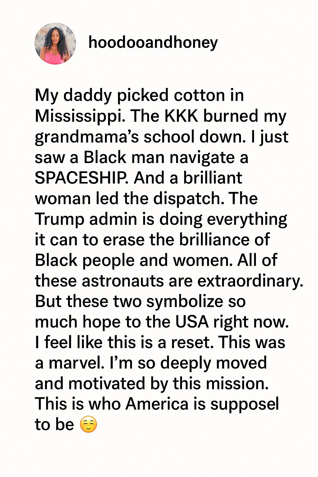The original message, shared by the Instagram user @hoodooandhoney, encompasses deep historical pain and groundbreaking progress: “My daddy picked cotton in Mississippi. The KKK burned my grandmama’s school down. I just saw a Black man navigate a SPACESHIP. And a brilliant woman l…”