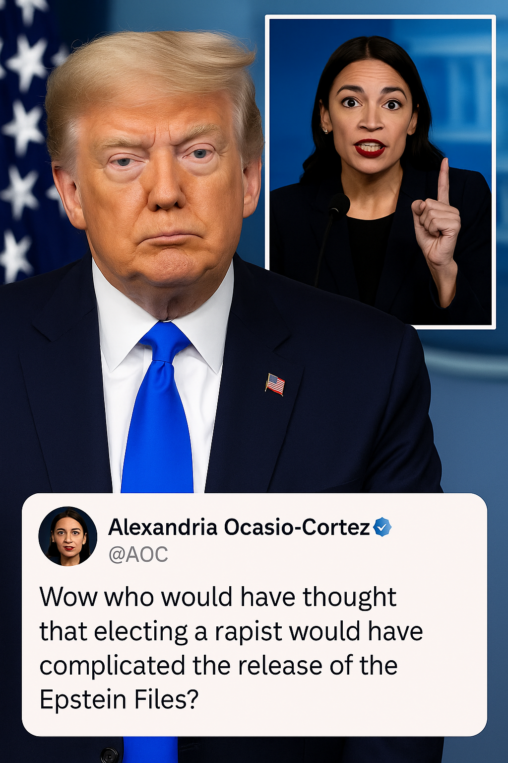 The post, which quickly went viral, featured an image of the Oval Office juxtaposed with a tweet from Ocasio-Cortez that read: “Wow who would have thought that electing a rapist would have complicated the release of the Epstein Files.” This incendiary statement indirectly linked Trump to allegations surrounding Epstein sex trafficking scandals, which have remained under intense scrutiny for years.
