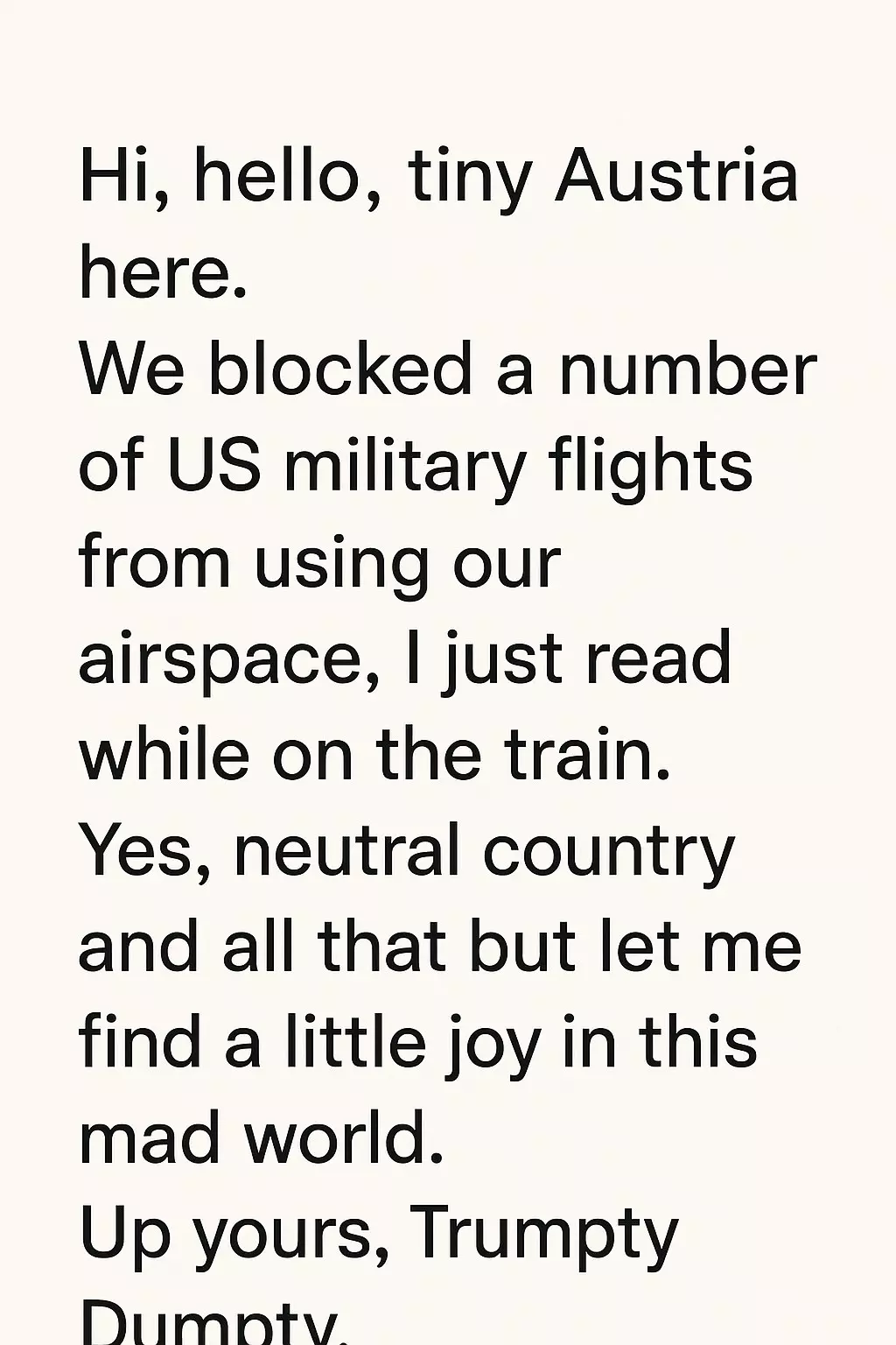 The revelation came to light in a viral social media post, where a user identifying as “tiny Austria” confirmed the decision while traveling by train. The message stated, “We blocked a number of US military flights from using our airspace, I just read while on the train. Yes, neutral country.” This succinct announcement opened up discussions about Austria’s role in the geopolitical landscape and the delicate balance it maintains between international alliances and its national policies.