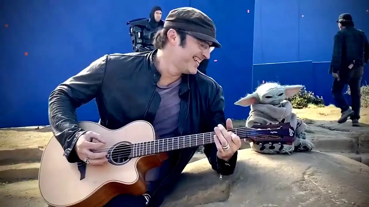 In this delightful behind-the-scenes moment, viewers are treated to an unexpected and whimsical sight: Baby Yoda, affectionately dubbed “The Child,” engaging in a playful jam session while the crew captures the magic of filmmaking. Amidst the lively atmosphere, a Dark Trooper stands in the background, comically embodying a sense of decorum as he clasps his hands, adding a humorous contrast to the enchanting scene. This charming interaction highlights the fun and camaraderie that often unfolds on set, reminding fans of the lighter side of bringing beloved characters to life.