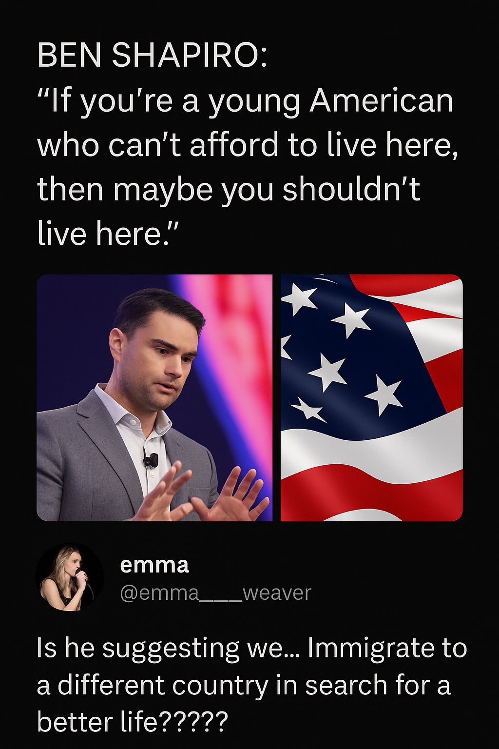 Ben Shapiro, the conservative political commentator, has once again stirred a heated debate on social media with a provocative statement regarding the affordability crisis facing young Americans. In a recent viral post, Shapiro said, “If you’re a young American who can’t afford to live here, then maybe you shouldn’t live here.” The comment quickly drew backlash, sparking widespread discussion about economic inequality and housing accessibility.