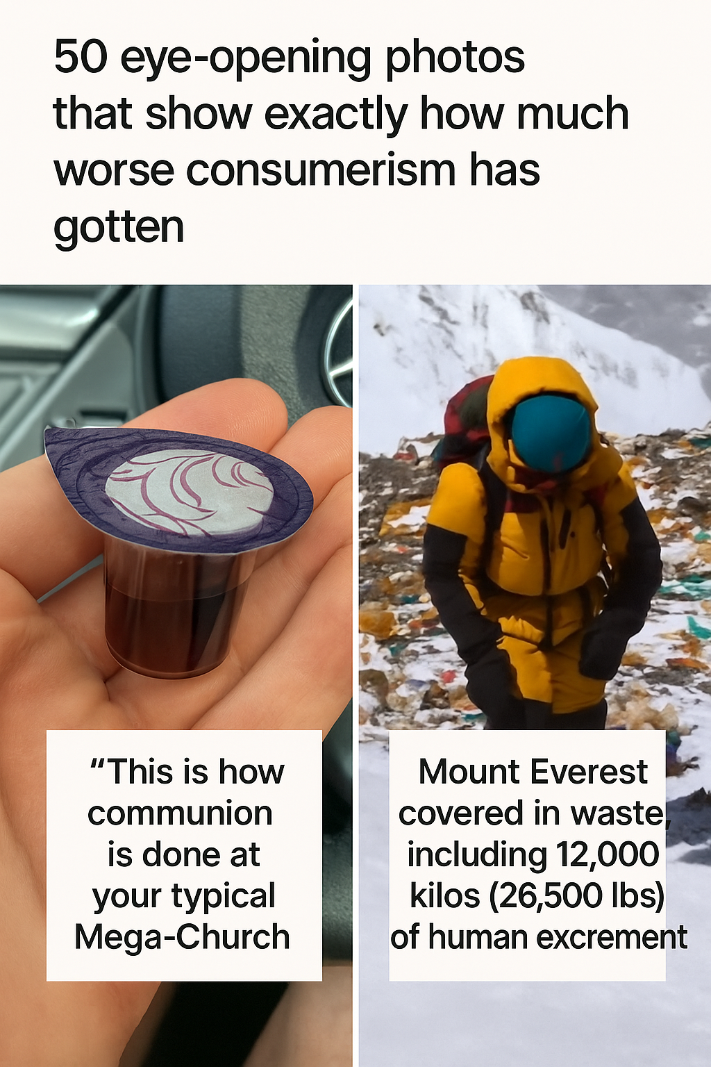 But the impact of consumerism extends beyond the walls of mega-churches. Other photos highlight scenes of overflowing shopping carts, rivers of single-use plastics, and mass-produced decorations flooding public spaces during holidays. These visuals underscore how consumer-driven practices continue to fuel environmental degradation, social inequality, and a disposable mindset.