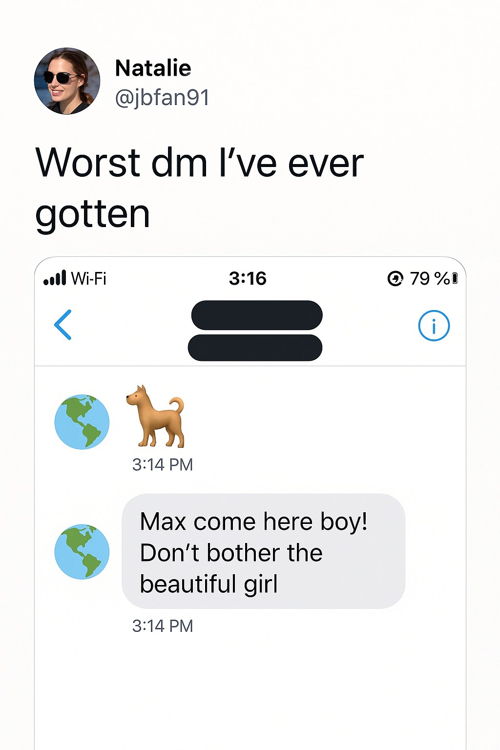 Natalie’s initial post showcased a screenshot from her phone featuring a message that read: “Max come here boy. Don’t bother the beautiful girl.” The odd phrasing and unsolicited tone sparked intrigue and laughter among her followers. The posting time and carrier details—“Verizon LTE 3:16 PM”—added an almost cinematic quality to the image, making it highly shareable. Natalie captioned the post: “Worst DM I’ve ever gotten X”, inviting others to join in sharing their own stories.
