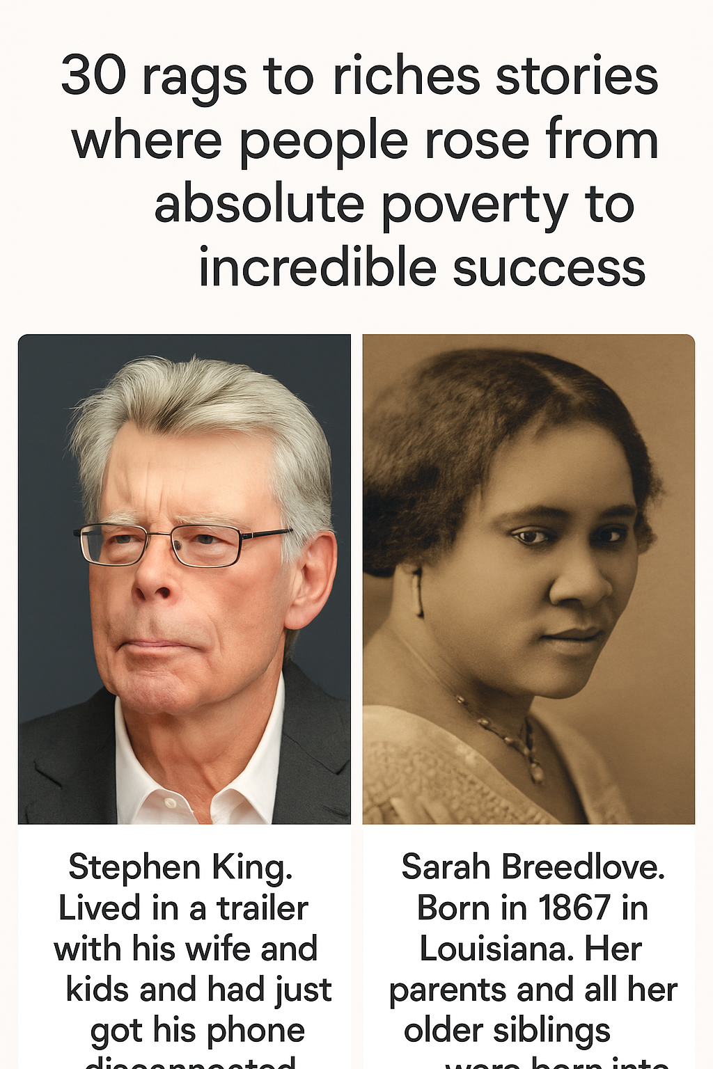Beyond Stephen King, a broader collection of 30 modern rags-to-riches stories has captivated social media and readers alike in 2024. These stories span continents and industries, showcasing individuals who overcame extreme poverty, homelessness, or severe setbacks to accomplish remarkable feats. From entrepreneurs and artists to athletes and educators, these inspiring accounts share common threads of resilience, passion, and relentless drive.