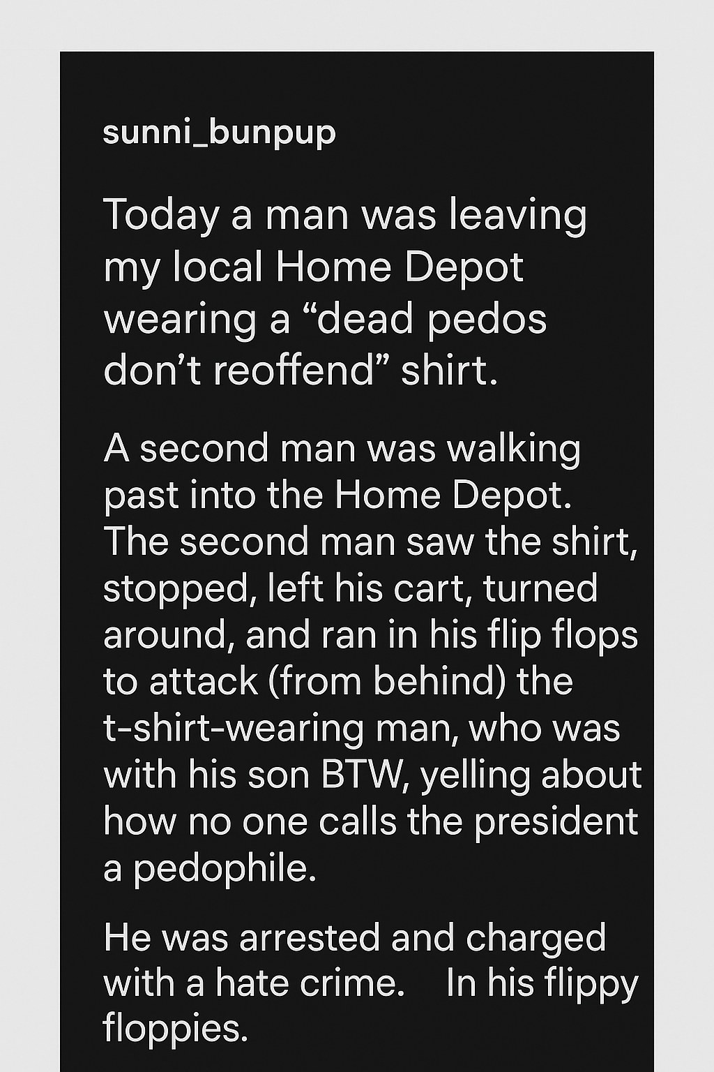 The original post, made by a user identified as sunni_bunpup, recounted seeing the man leave the retail store sporting the provocative shirt. The message on the shirt—a blunt and unapologetic stance against child predators—prompted strong reactions from passersby and netizens alike. Adding tension to the moment, as the man departed, a second individual was seen walking into the Home Depot, triggering further speculation among witnesses and commenters.