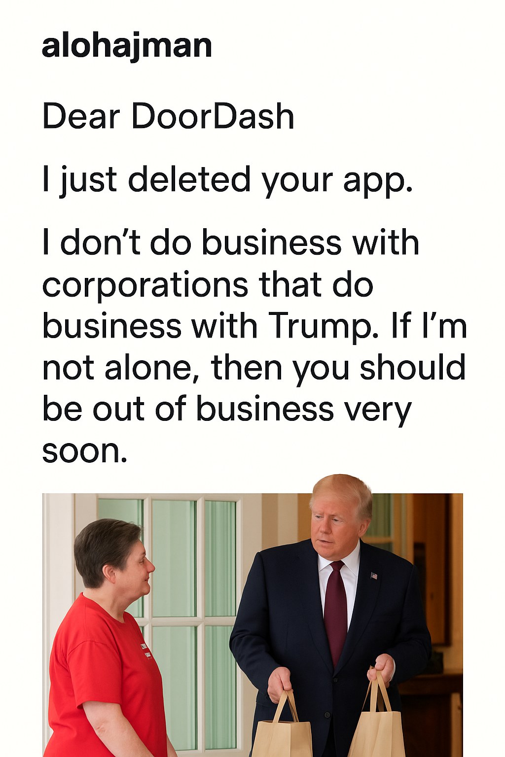 In a rapidly evolving social media controversy, a growing number of consumers are deleting the DoorDash app, citing the food delivery giant’s purported business dealings with former President Donald Trump. The movement gained traction after an image went viral featuring a user named “alohajman,” who posted a candid message stating they had deleted DoorDash specifically because the company does business with Trump.
