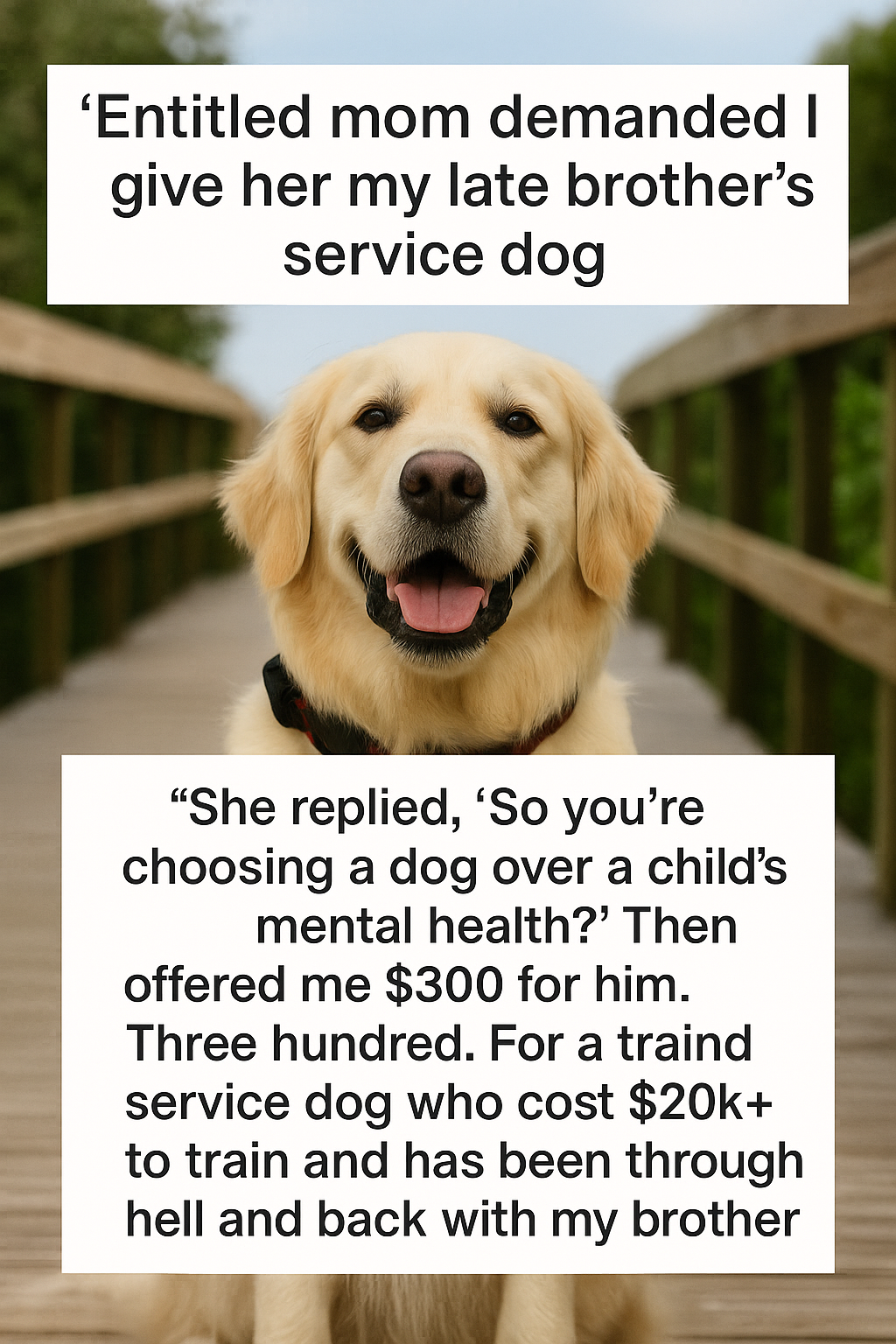 According to the account, after the brother’s passing, the service dog remained with the poster as a source of comfort and support. The mother, struggling with her own child’s mental health challenges, requested custody of the dog, arguing that her child would also benefit from the animal’s unique support. When refused, she reportedly confronted them with the accusation: “So you’re choosing a dog over a child’s mental health?” To add pressure to the emotionally charged situation, the mother even offered a sum of money in exchange for the dog’s custody.