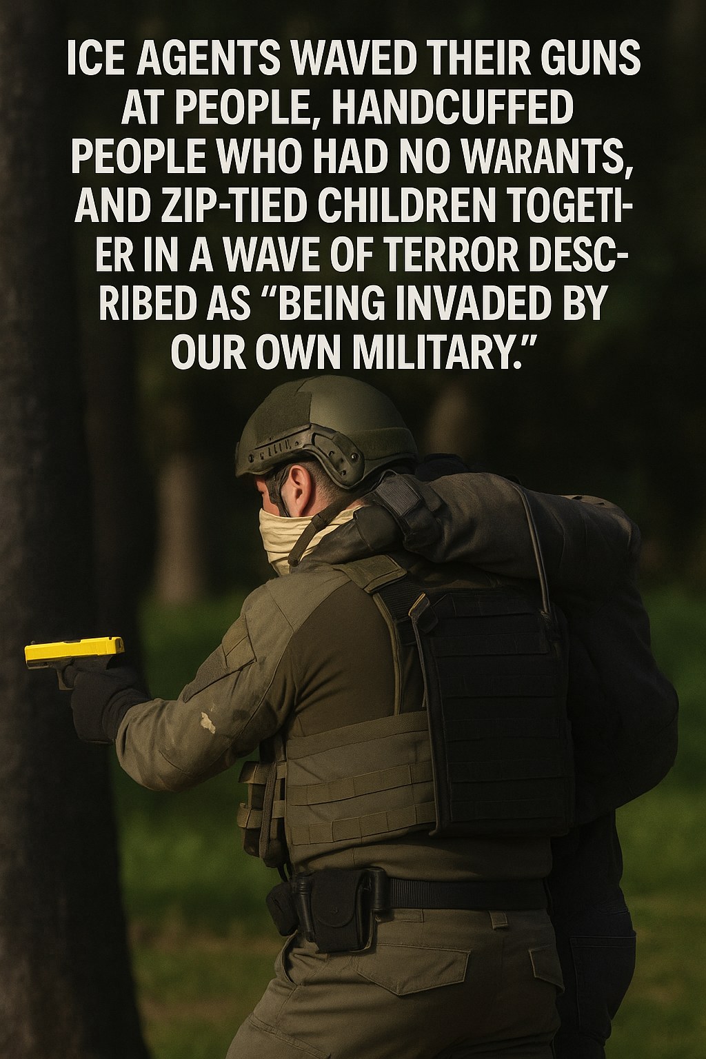 In a series of shocking incidents that many are describing as a military-style offensive in their communities, ICE (Immigration and Customs Enforcement) agents reportedly waved guns at individuals, handcuffed people without warrants, and even zip-tied children together. Witnesses have shared harrowing accounts of these encounters, with some likening the experience to “being invaded by our own military.”
