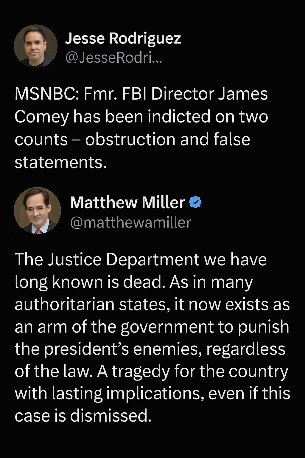 In a shocking turn of events, former FBI Director James Comey has been indicted on charges of obstruction of justice and making false statements. This news broke in a tweet by MSNBC’s Jesse Rodriguez, sparking immediate reactions across social media platforms.