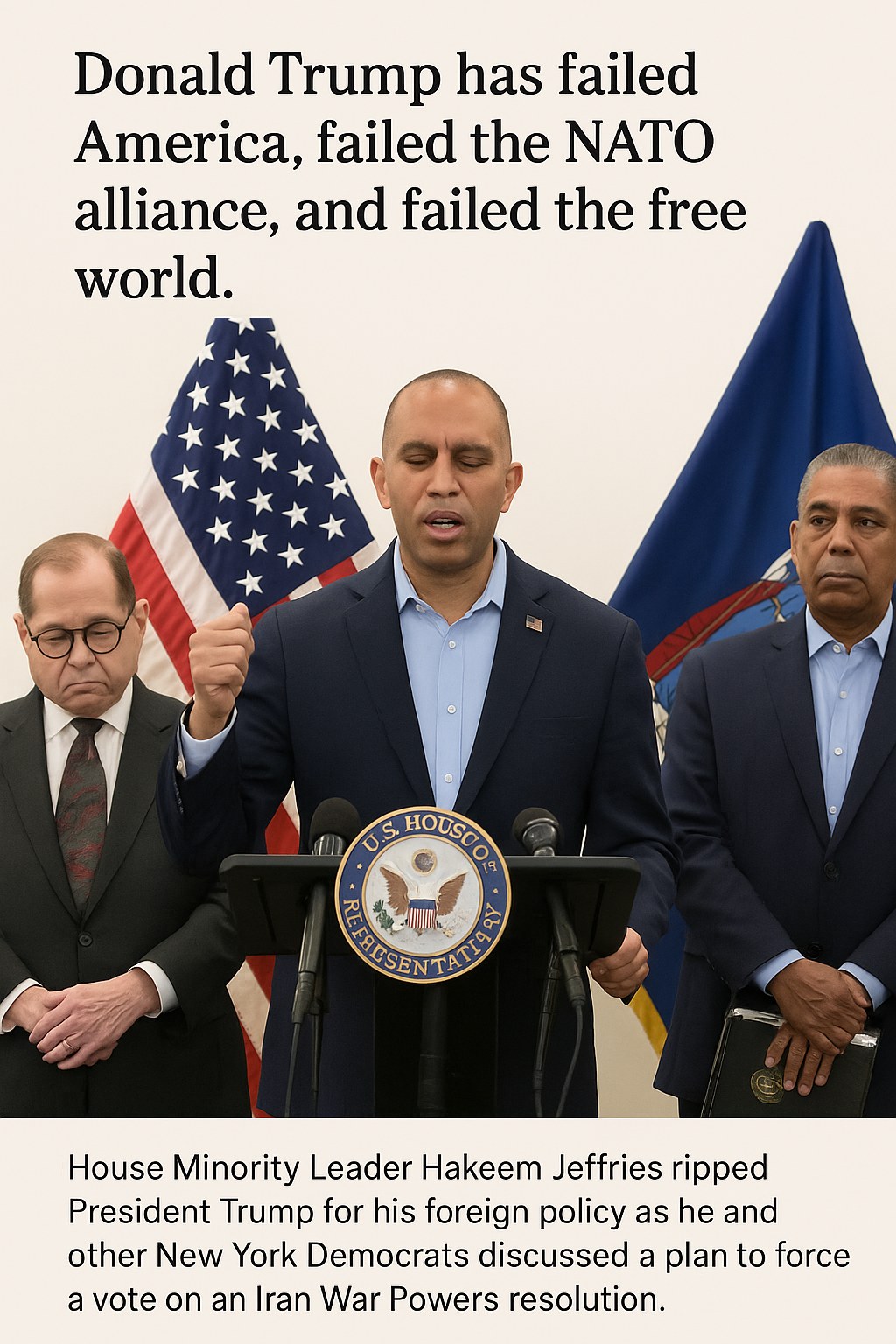 House Minority Leader Hakeem Jeffries delivered a scathing rebuke of former President Donald Trump’s record on foreign policy, declaring that Trump “has failed America, failed the NATO alliance, and failed the free world.” The fiery criticism came as Jeffries and fellow New York Democrats joined forces to push for a congressional vote on an Iran War Powers resolution, aiming to rein in presidential authority over military actions in the Middle East.