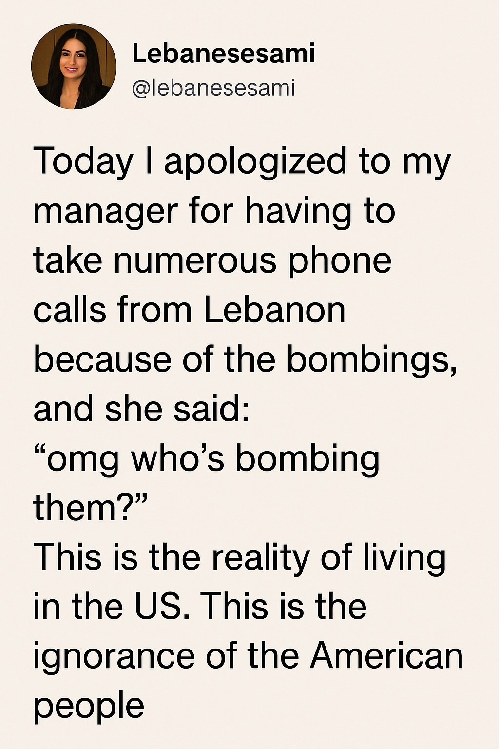 The post features a simple yet powerful exchange. The employee explained that they had to take multiple urgent phone calls from Lebanon amid recent bombings, which interrupted their workday. Apologizing for the disruption, they were met with an empathetic response from their manager, who asked, “omg who’s bombing?” This question, seemingly casual, underscores the reality that many outside Lebanon are only just becoming aware of the severity of the situation.