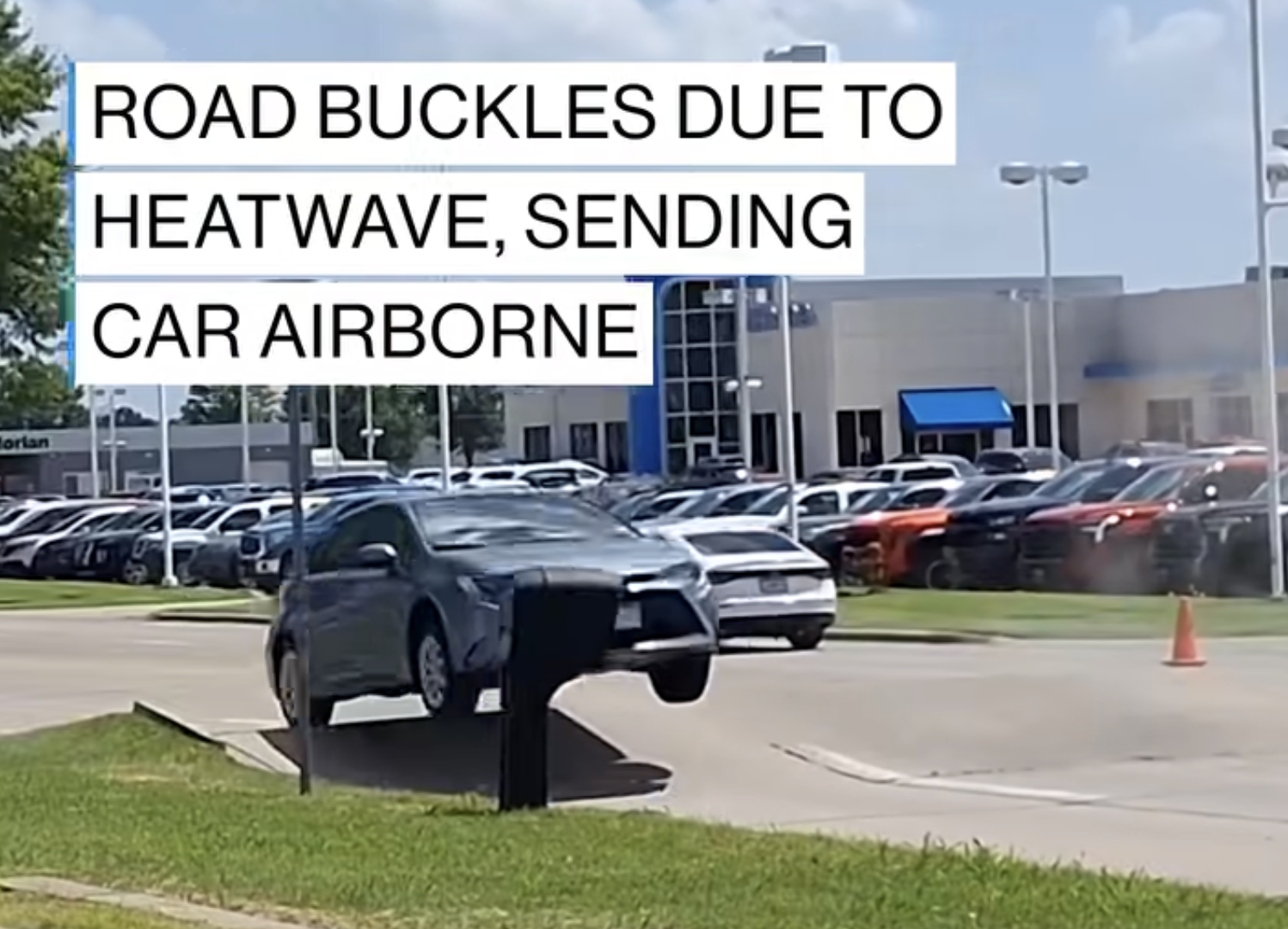 The footage reveals a car speeding along when it suddenly hits a severely buckled section of pavement, sending it airborne in a scene straight out of an action movie. The road’s deformation, caused by soaring temperatures, created a dangerous ramp-like effect that caught the driver off guard.