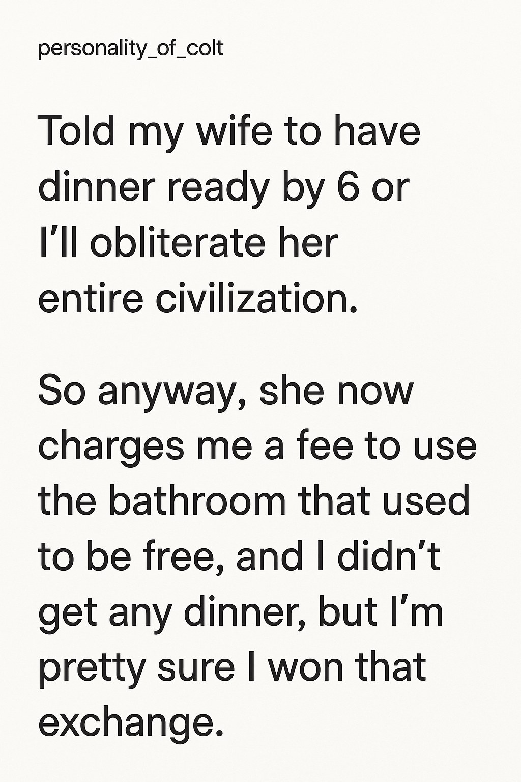 The original message posted read: “Told my wife to have dinner ready by 6 or በዘ obliterate her entire civilization. So anyway, she now charges me a fee to use the bathroom.” The post quickly gained traction for its blend of hyperbole, humor, and relatable marital banter, sparking countless memes and reactions across multiple platforms.