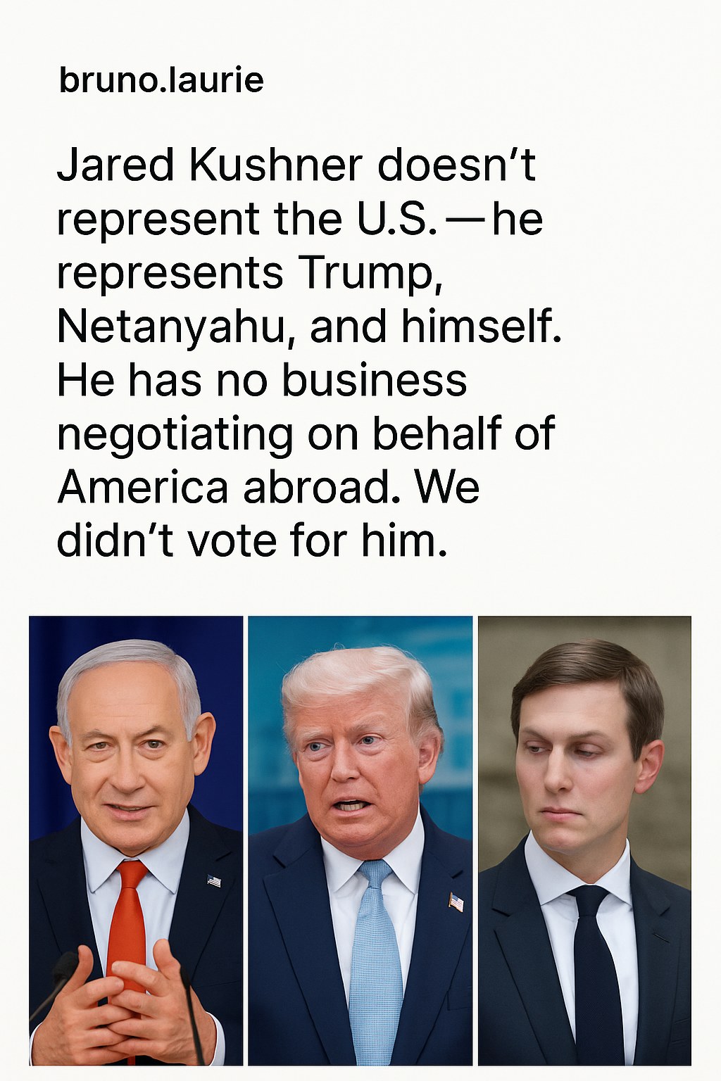 The post bluntly asserts: “Jared Kushner doesn’t represent the U.S.—he represents Trump, Netanyahu, and himself. He has no business negotiating on behalf of America abroad.” This message reflects a growing sentiment among critics who question Kushner’s impartiality and alignment, especially considering his close ties to both Trump and Israeli Prime Minister Benjamin Netanyahu.