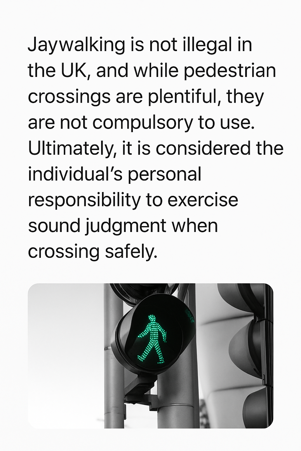 This practical and permissive stance is rooted in the UK’s road traffic legislation, which emphasizes shared responsibility among drivers and pedestrians. Drivers are legally required to watch for pedestrians and give way where appropriate. Similarly, pedestrians should use judgment and common sense when deciding where to cross. This balance encourages safety while recognizing everyday realities of urban and rural walking.