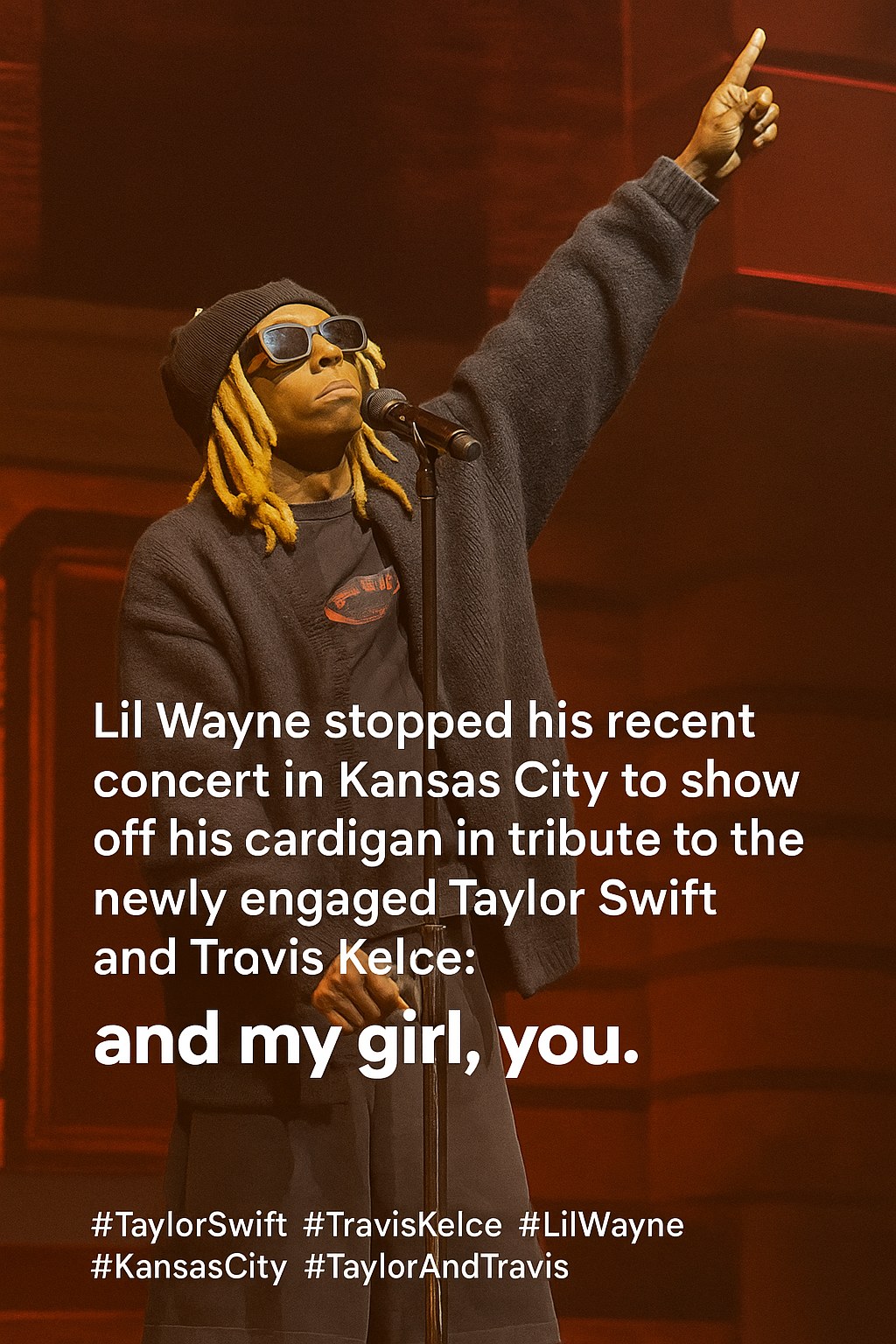 In a heartfelt yet humorous moment during his recent Kansas City concert, rap icon Lil Wayne took a brief pause in his set to honor pop superstar Taylor Swift and NFL star Travis Kelce following their highly publicized engagement. The rapper displayed a cardigan reminiscent of Swift’s signature cozy style, signaling his enthusiasm for the newly engaged couple and their unexpected but beloved union.