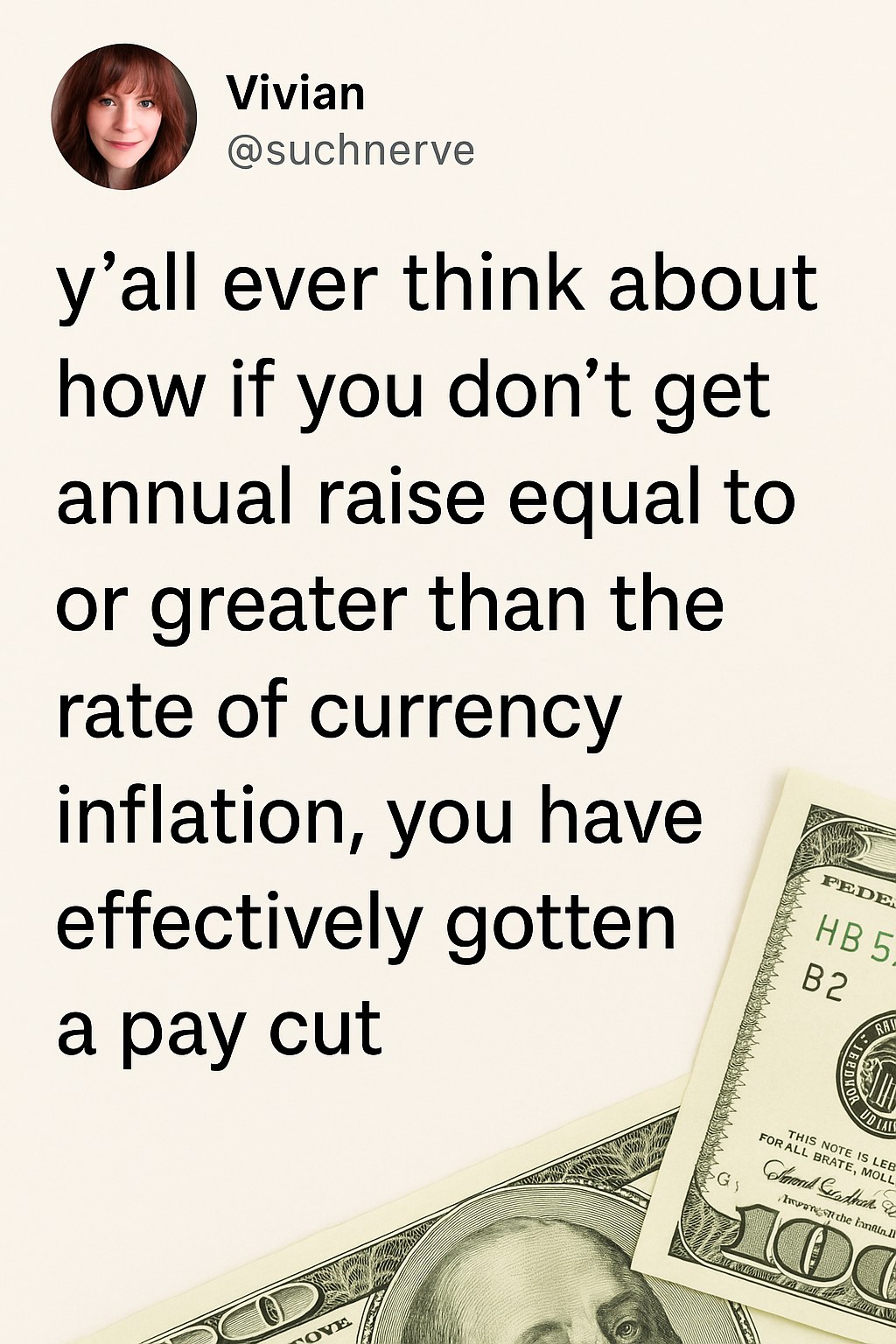 In the age of rising prices and economic uncertainty, a viral social media post from user @suchnerve has sparked an essential conversation about personal finance and employment. The post, featuring a striking image of money alongside a thought-provoking statement, reads: “Y’all ever think about how if you don’t get an annual raise equal to or greater than the rate of currency inflation, you have effectively taken a pay cut?” This sentiment resonates with many, as inflation continues to erode purchasing power across the globe.