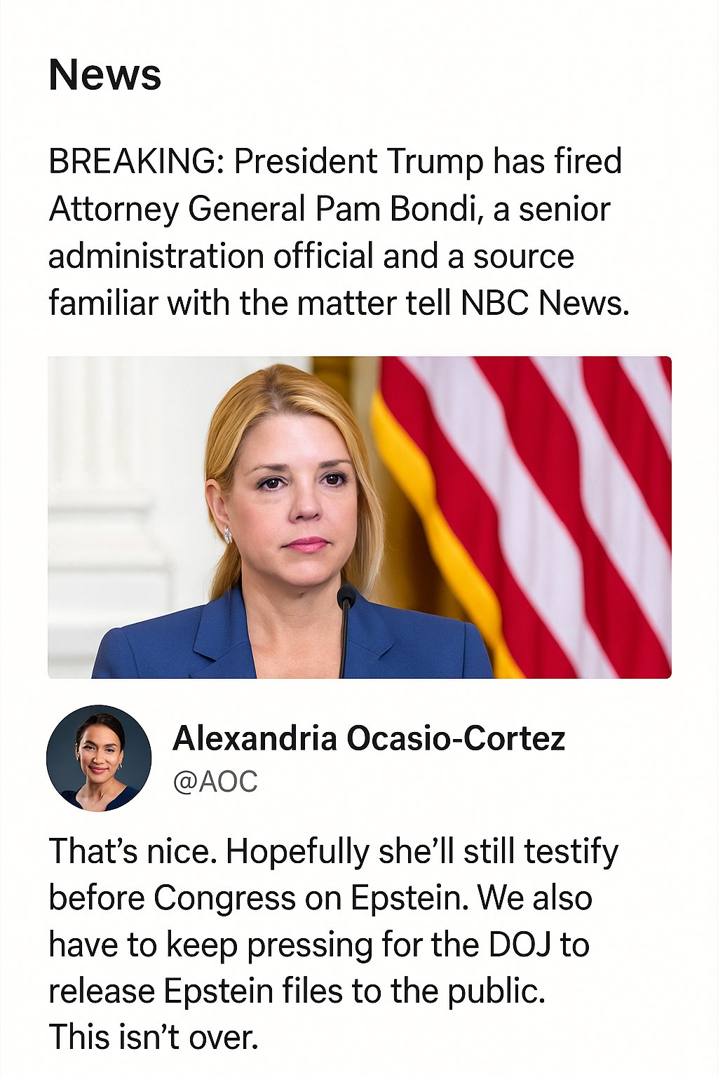 The news first broke on social media, with NBC News tweeting: “BREAKING: President Trump has fired Attorney General Pam Bondi, a senior administration official and a source familiar with the matter.” The announcement was followed by a ripple of responses from political commentators, legal experts, and public figures.