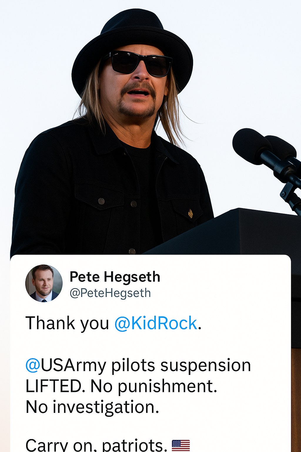 On Monday, Secretary Hegseth took to Twitter to share the decision with an emphatic message that resonated strongly with supporters, writing: “Thank you @KidRock. @USArmy pilots suspension LIFTED. No punishment. No investigation. Carry on, patriots.” The tweet included an image of a military hat, symbolizing both authority and solidarity.