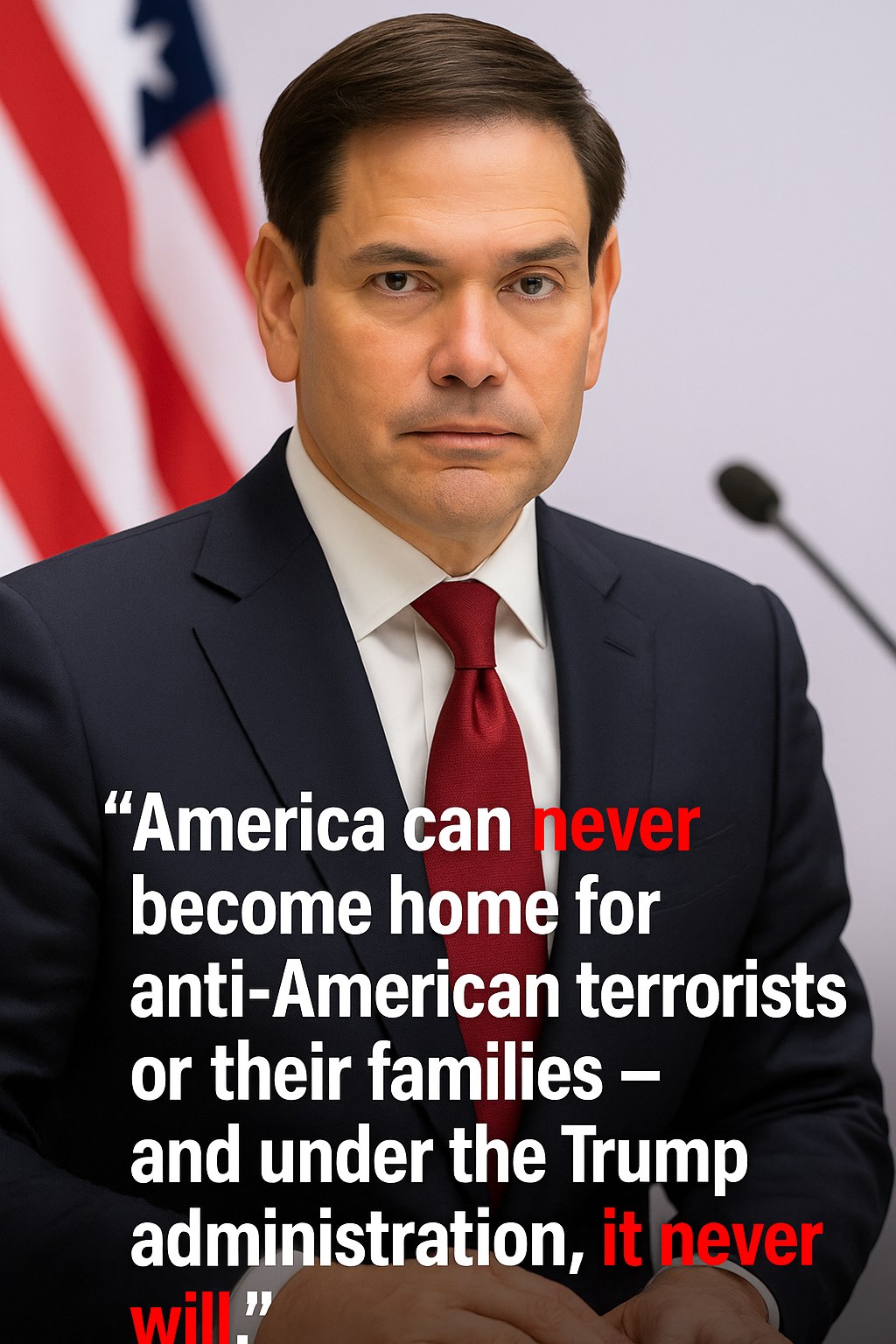 Secretary Rubio emphasized the importance of protecting American soil from the presence of individuals linked to terrorist activities, explaining that “America can never become home for anti-American terrorists or their families.” This statement was accompanied by a strong message depicted in a graphic referencing the Oval Office and a Fox News Channel quote highlighting the Trump administration’s hardline stance on national security and immigration enforcement.