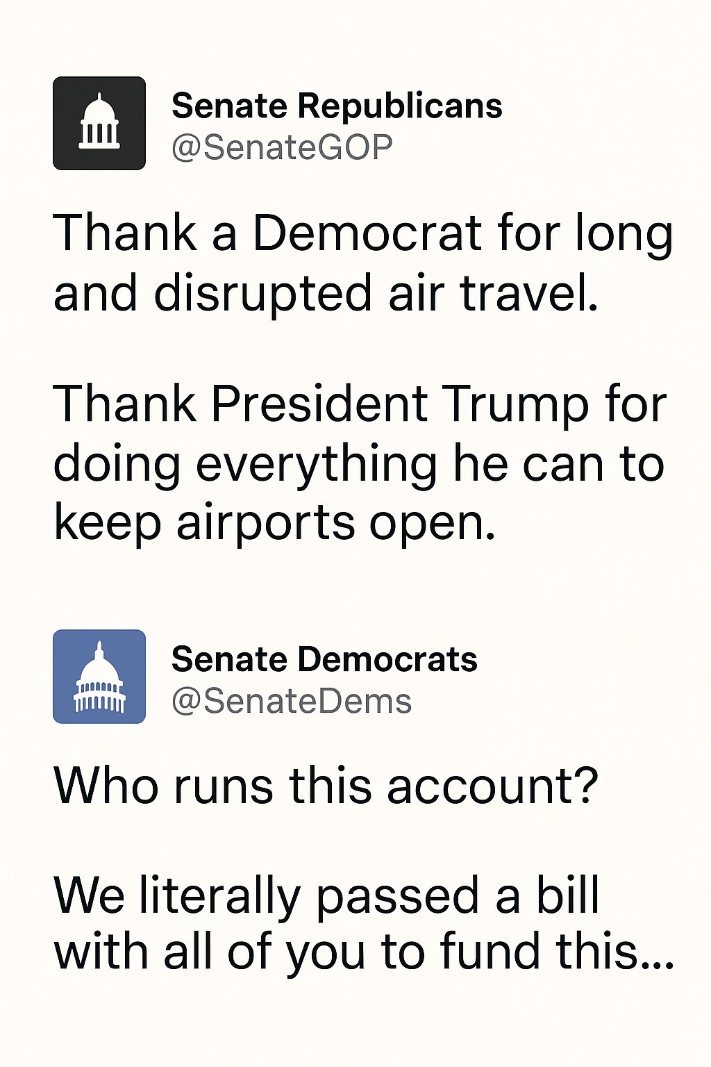 In a recent flurry of social media exchanges, tensions between Senate Republicans and Democrats have intensified over the management of the ongoing nationwide air travel disruptions. A viral post circulating on social platforms from the official Senate GOP account captured the controversy succinctly, stating, “Thank a Democrat for long and disrupted air travel. Thank President Trump for doing everything he can to keep airports open.“
