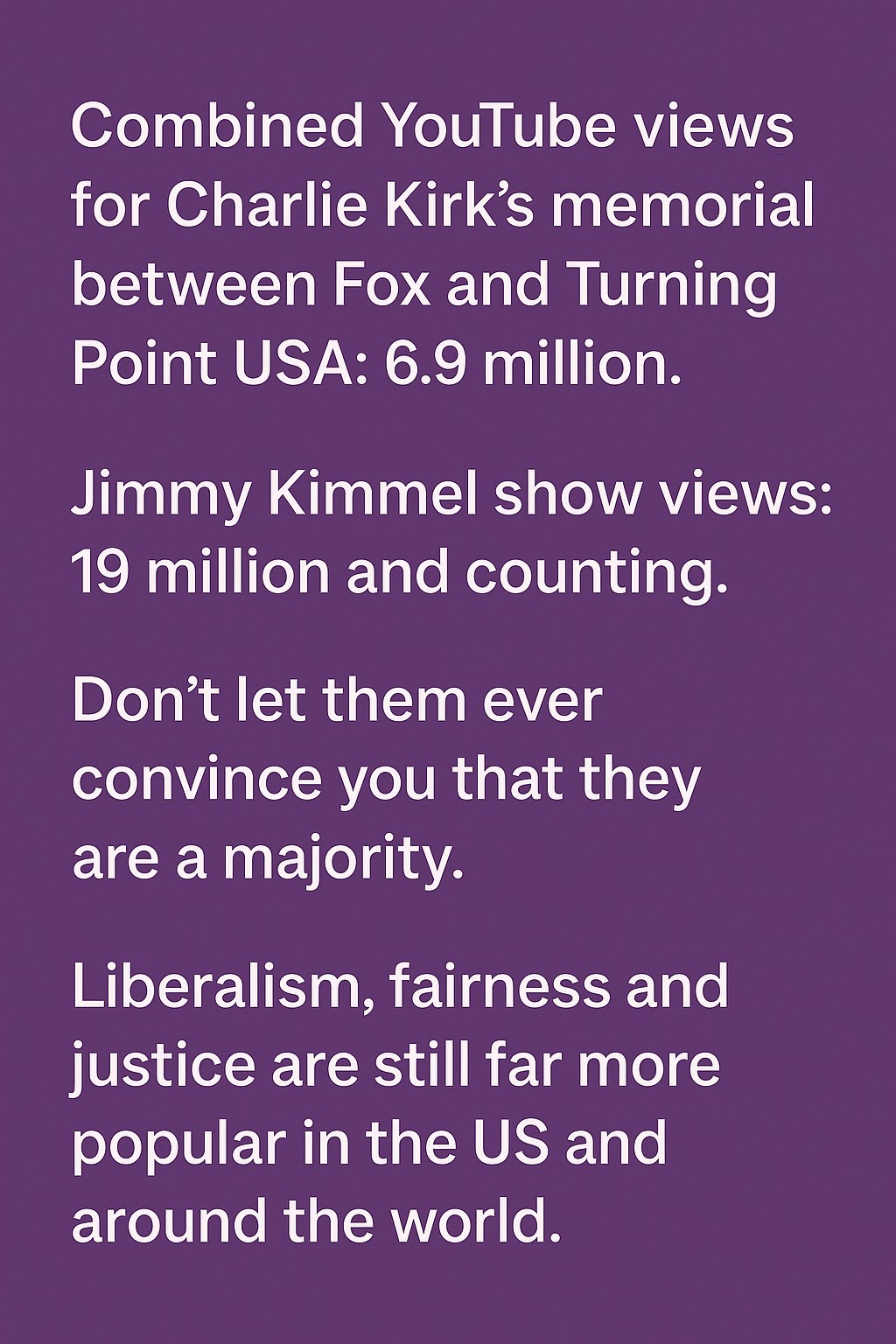 The image, showcasing statistics, notes that Charlie Kirk’s memorial—hosted by Turning Point USA and featured by Fox News—has garnered a combined total of 6.9 million YouTube views. In contrast, Jimmy Kimmel’s late-night television show has eclipsed this figure, racking up an impressive 19 million views and counting. The juxtaposition of these numbers has become a talking point online, drawing reactions from both sides of the political spectrum.