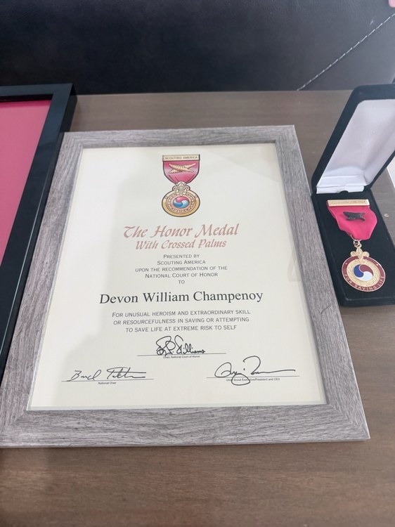 In recognition of his extraordinary bravery, Devon was nominated by his Scout Leader for the Honor Medal with Crossed Palms, which acknowledges unusual heroism in saving a life. This honor is a rare achievement, having been bestowed fewer than 300 times in over a century of the Boy Scouts of America.