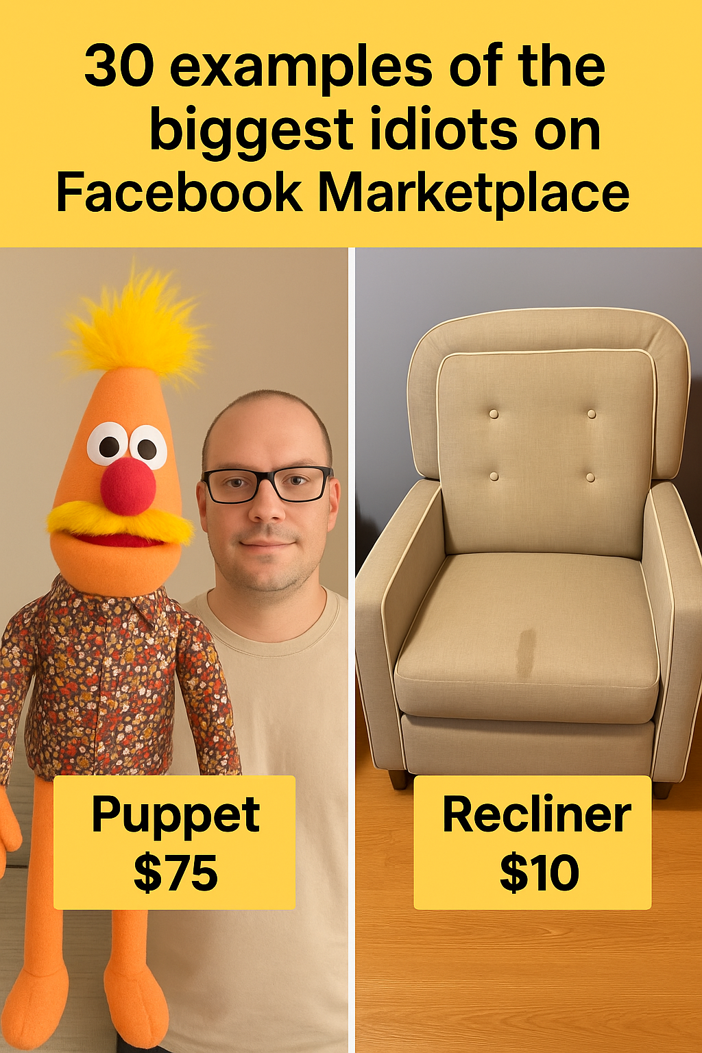 The post features an image teasing standout examples, including a puppet priced absurdly at $75 and a recliner listed for just $10, setting the tone for a collection of questionable bargains and tragic mishaps that highlight just how chaotic Facebook Marketplace transactions can be.
