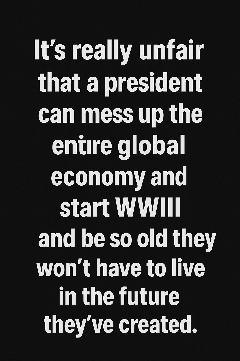 In a poignant and blunt expression that has captured the attention of social media users worldwide, a viral message lamented the profound inequality and frustration many feel in today’s global political landscape. The message, which rapidly circulated across platforms, states, “It’s really fucking unfair that a president can fuck up the entire global economy and start WWIII and be so old they won’t have to live in the future they’ve created.”