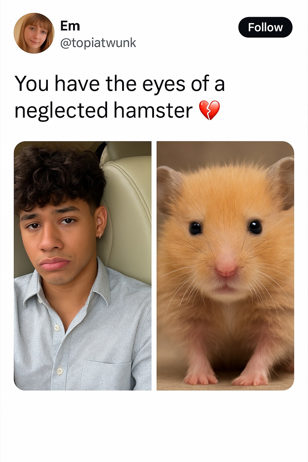 Almost immediately, fellow internet denizen @jesus1hunnid shared the post, igniting a frenzy among meme lovers who saw themselves in the quirky hamster eyes stare. The relatable humor resonated widely, inspiring a slew of creative spin-offs, including videos, reaction images, and even cosplay recreations of the iconic “hamster stare.”