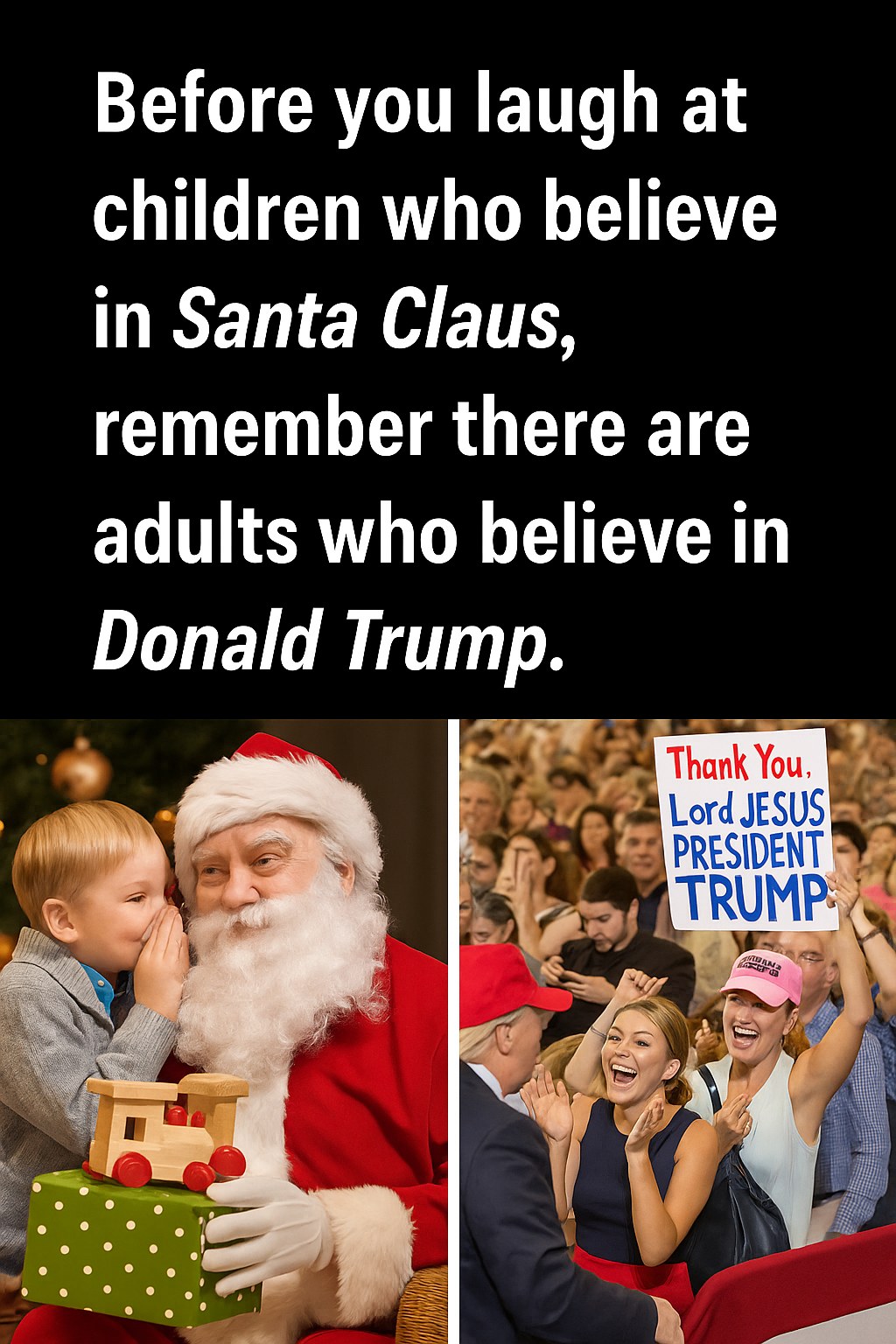 In the ever-evolving landscape of social media, a recent viral post has captured widespread attention for its provocative comparison between childhood innocence and adult political allegiance. An image circulating widely suggests: “Before you laugh at children who believe in Santa Claus, remember there are adults who believe in Donald Trump.” The post, often concluded with statements like “Thank You Lord JESUS, PRESIDENT TRUMP TRUNG,” has stirred intense conversations about faith, politics, and belief systems in America today.