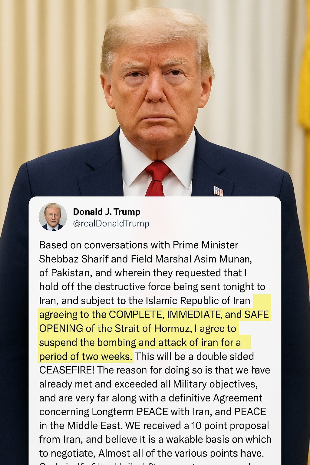 In a stunning development late today, President Donald Trump agreed to a two-week ceasefire with Iran, conditionally halting all bombing and offensive attacks in exchange for the reopening of the strategically vital Strait of Hormuz.