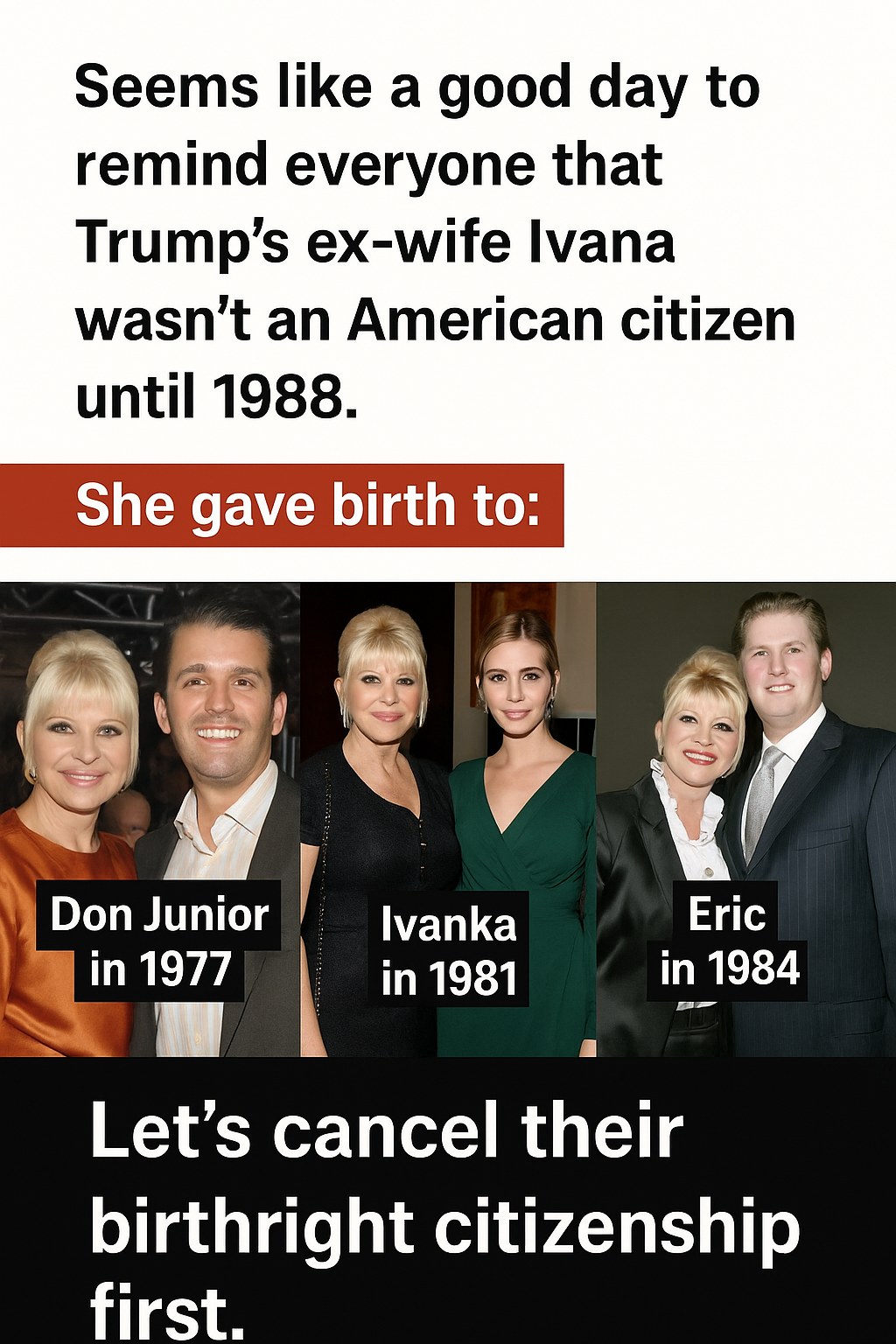 Recently, a social media post has sparked renewed interest in the citizenship status of Ivana Trump, the first wife of former President Donald Trump, highlighting that she wasn’t an American citizen until 1988. This reminder about Ivana Trump’s naturalization timeline also underscored an intriguing fact: she gave birth to three of Donald Trump’s children—Donald Jr. (born 1977), Ivanka (born 1981), and Eric (born 1984)—well before becoming a U.S. citizen.