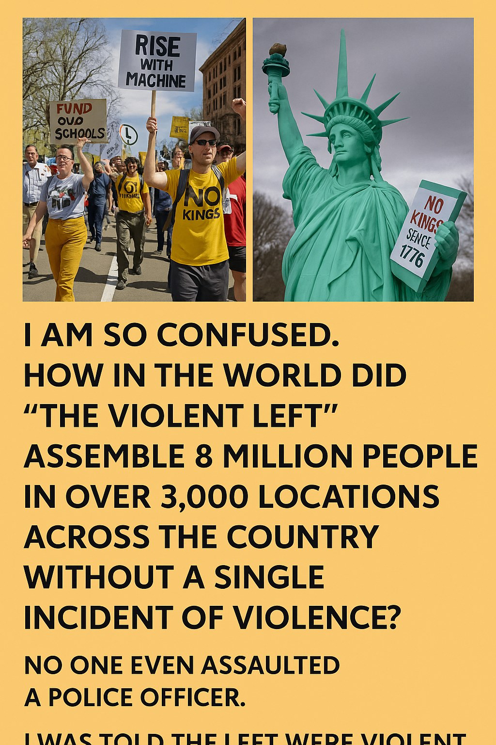 The post suggests a bewilderment over how millions could be mobilized so widely and rapidly, particularly blaming a political faction colloquially dubbed “the violent left.” This phrase has frequently been used by various commentators in political discourse, often in polarizing contexts.