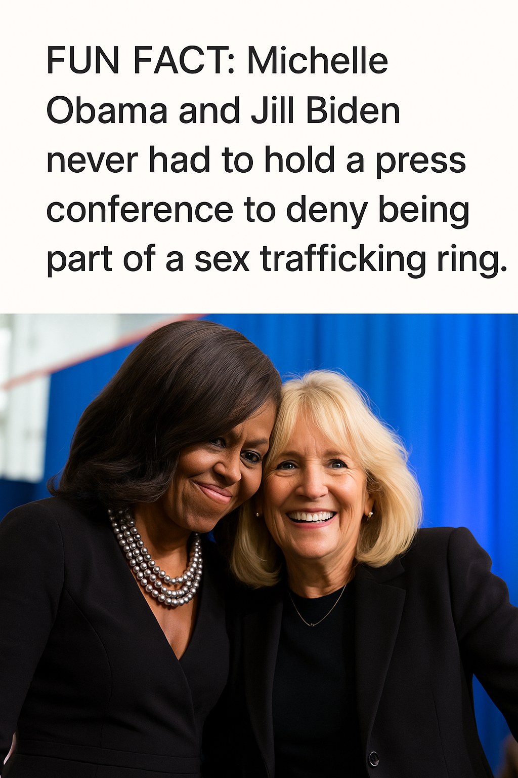 The image circulating on platforms like Twitter and Instagram asserts what it calls a “fun fact,” stating that both Michelle Obama and Jill Biden never needed to hold press conferences to deny participation in a sex trafficking ring. This claim is misleading on multiple levels.
