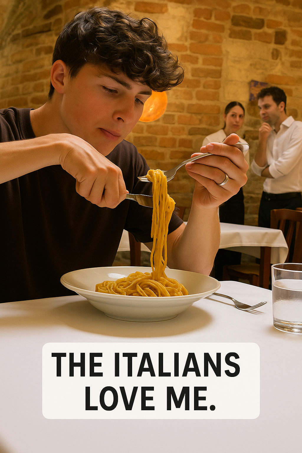 Witnesses say Bro’s casual approach stood out amid the carefully coordinated guests clad in vibrant reds, greens, and whites—the colors of the Italian flag—while sharing plates of carbonara, bolognese, and artisanal fettuccine. A photographer captured Bro looking slightly bewildered but good-natured, holding a forkful of plain penne pasta, which ultimately became the iconic image that sparked the meme.