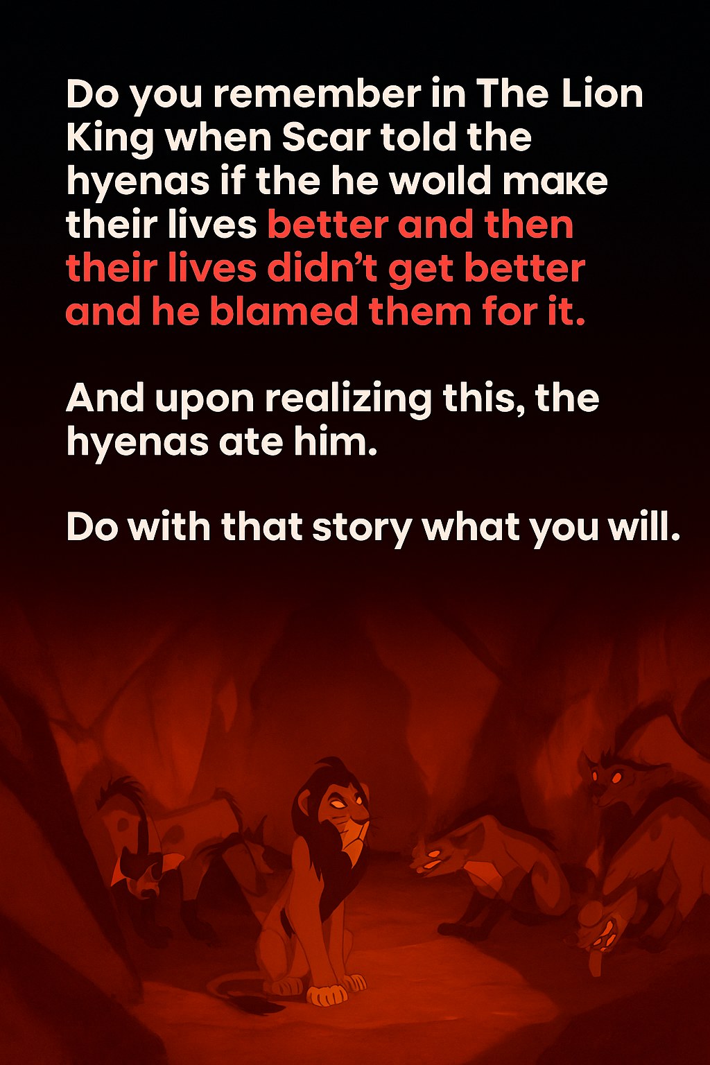 The Lion King is an iconic film that has captivated audiences for decades, not only for its stunning animation and memorable music but also for its complex characters and compelling storylines. One particular moment that has sparked viral conversation across social media is the infamous promise Scar makes to the hyenas: “Help me become king, and I’ll make your lives better.” But as many fans know, the hyenas’ lives didn’t improve—in fact, they arguably worsened under Scar’s reign. This aspect of the movie has become a powerful metaphor for broken promises and manipulative leadership.