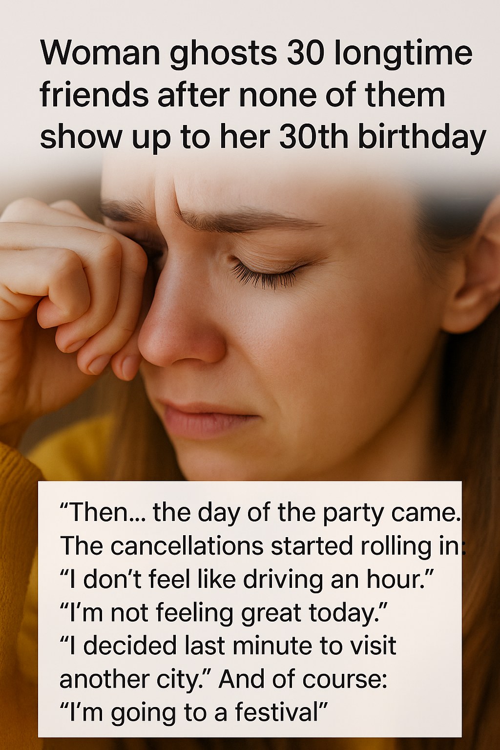 “Then… the day of the party came. The cancellations started rolling in,” a snippet from the woman’s now-viral message explained. One by one, friends excused themselves citing a range of reasons from sudden work commitments to personal emergencies. Ultimately, not a single friend attended, leaving her birthday party empty and her feelings deeply hurt.